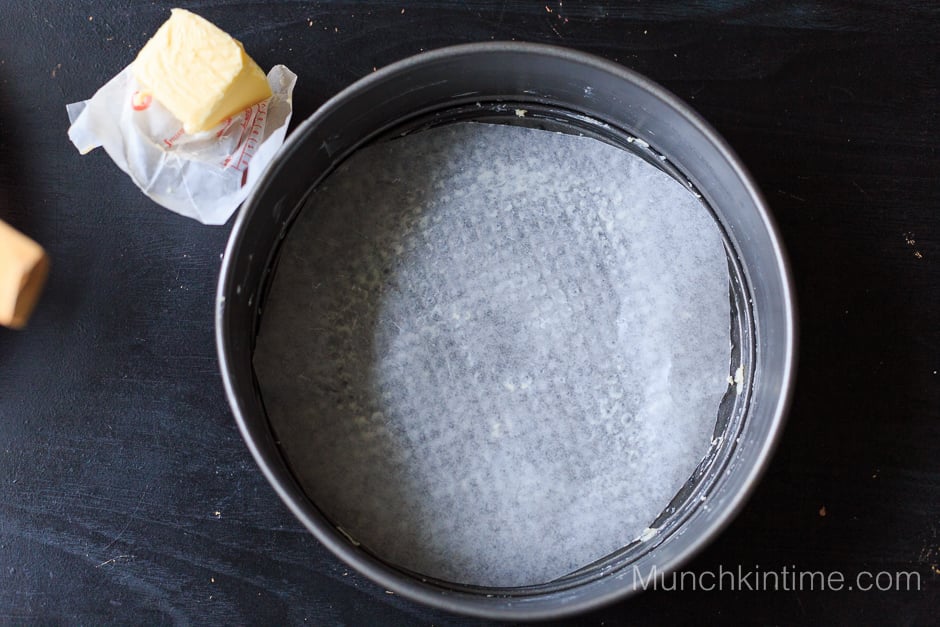 Grease 9 inch baking pan with butter then add a cut out parchment paper inside the baking pan.